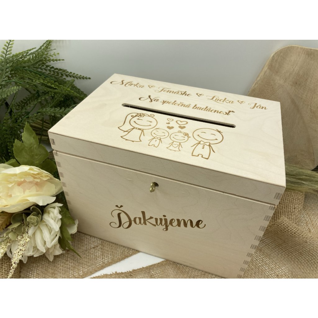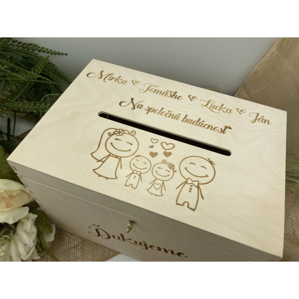 Naša rodinná drevená pokladnička je zdobená precíznou gravírovanou rodinkou, čo dodáva jej dizajnu elegantný a osobný dotyk. Tento štýlový kus nielenže uchováva vaše cennosti, ale tiež slúži ako výnimočný dekoratívny prvok, ktorý zdôrazňuje dôležitosť rodiny vo vašom živote.