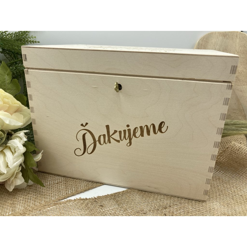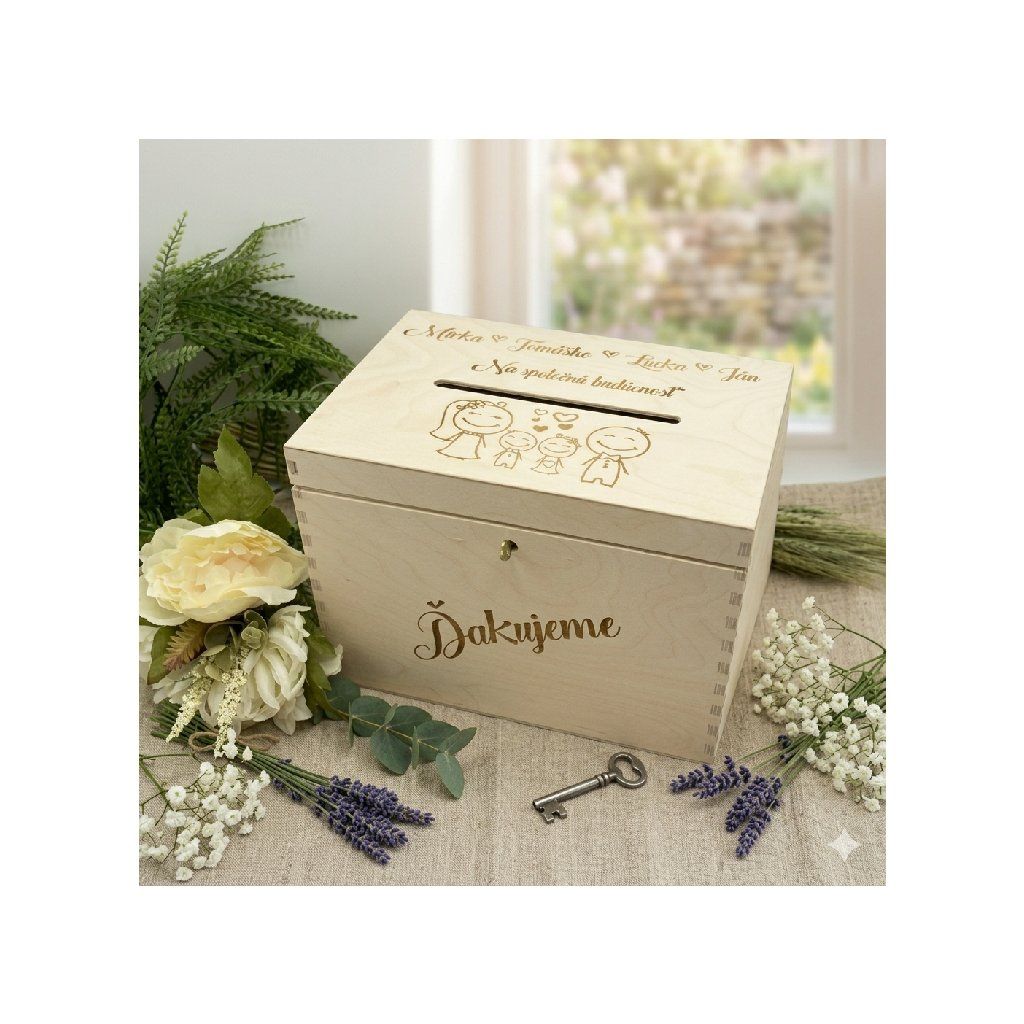 Mená a dátum svadby nám napíšte do poznámky ku produktu, taktiež aj farbu pokladničky BIELA alebo PRÍRODNÁ.