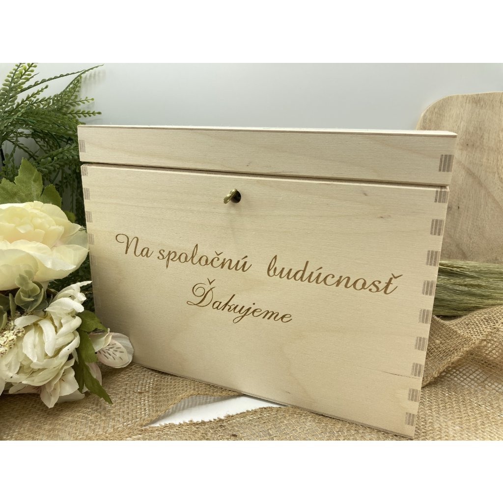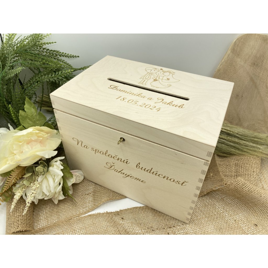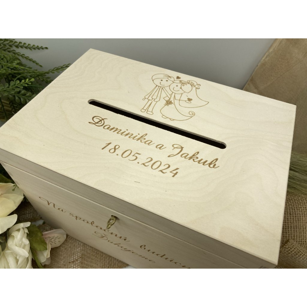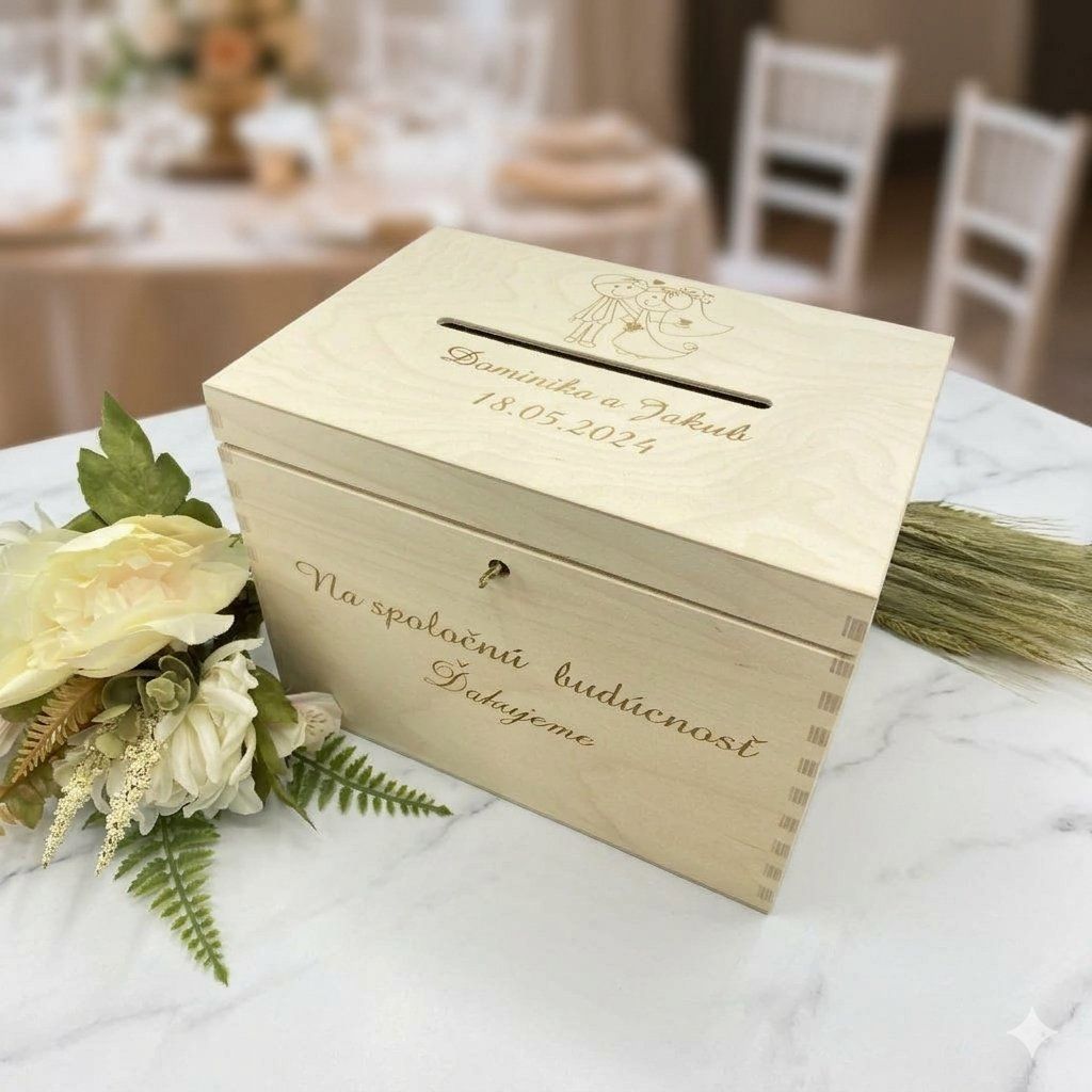 V našej drevenej svadobnej pokladničke sa líši každý detail ako živá melódia lásky. Na jej vrchole sa tichým šepotom preplietajú vygravírované mená ženícha a nevesty, zosobňujúce ich spojenie, spolu s nezabudnuteľným dátumom ich svadby. Tento klenot nie je len symbolom vášho vzájomného zväzku, ale aj úložiskom pre vzácne spomienky a dary od svadobních hostí .Pokladničky máme na výber dve farby a to BIELU a PRÍRODNÚ DREVENÚ.