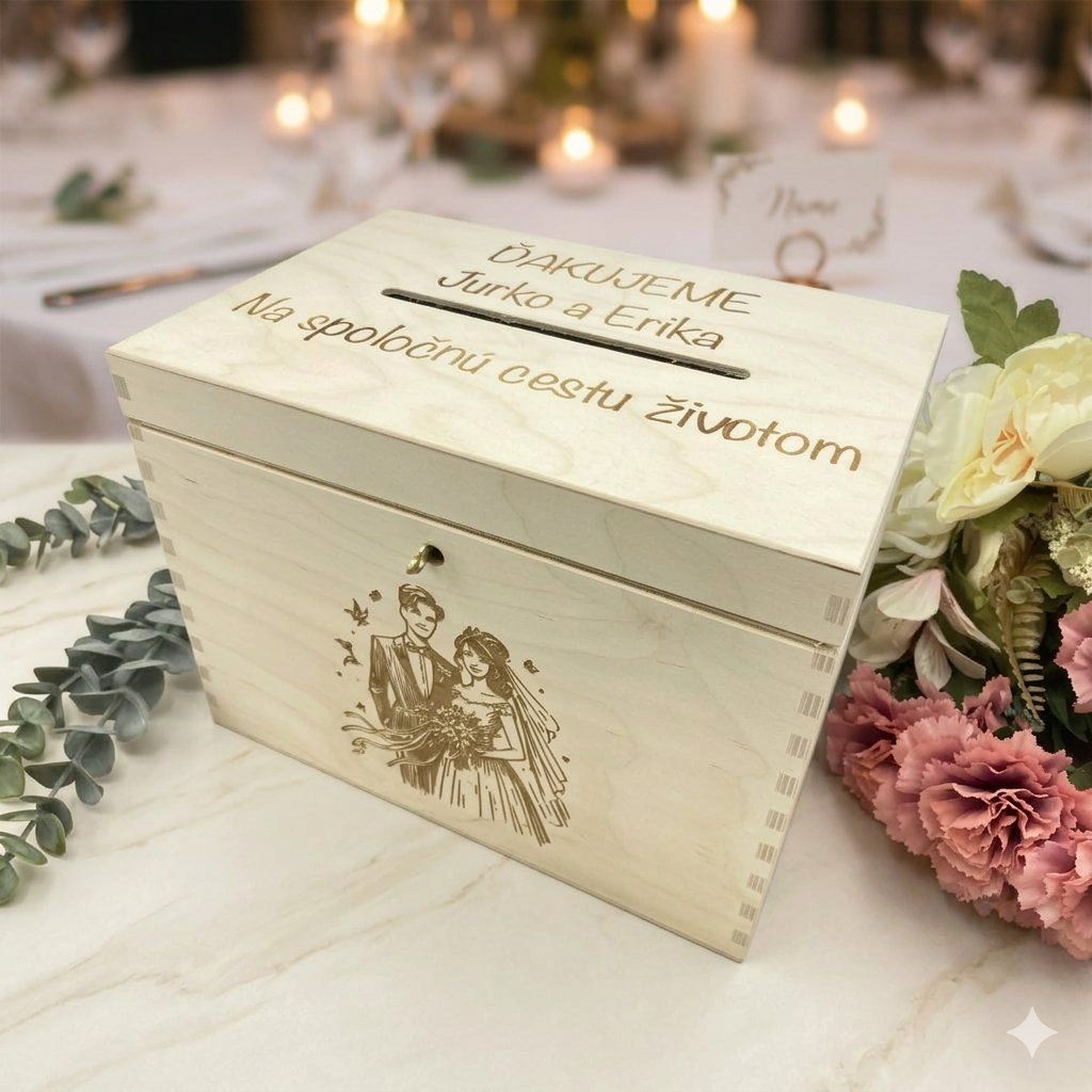 V našej drevenej svadobnej pokladničke sa líši každý detail ako živá melódia lásky. Na jej vrchole sa tichým šepotom preplietajú vygravírované mená ženícha a nevesty, zosobňujúce ich spojenie, spolu s nezabudnuteľným dátumom ich svadby. Tento klenot nie je len symbolom vášho vzájomného zväzku, ale aj úložiskom pre vzácne spomienky a dary od svadobních hostí .Pokladničky máme na výber dve farby a to BIELU a PRÍRODNÚ DREVENÚ.