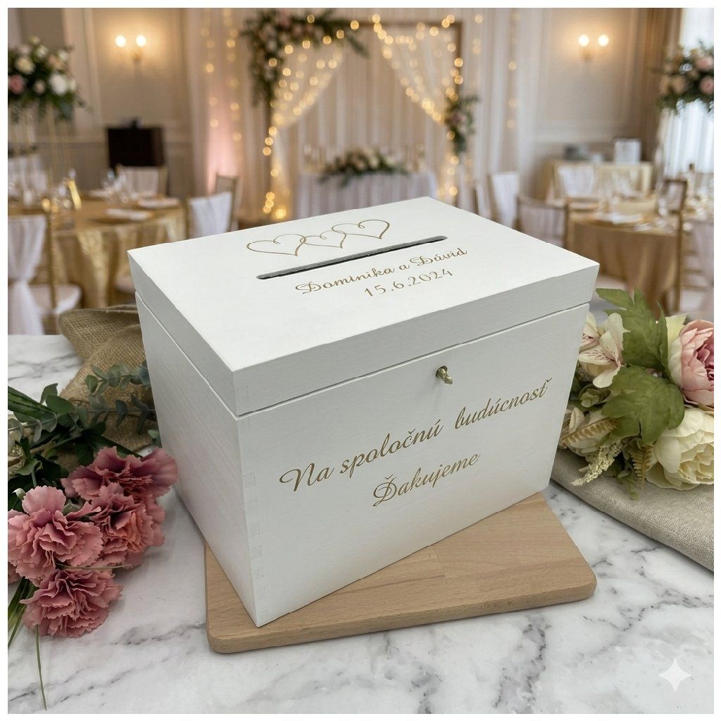 V našej drevenej svadobnej pokladničke sa líši každý detail ako živá melódia lásky. Na jej vrchole sa tichým šepotom preplietajú vygravírované mená ženícha a nevesty, zosobňujúce ich spojenie, spolu s nezabudnuteľným dátumom ich svadby. Tento klenot nie je len symbolom vášho vzájomného zväzku, ale aj úložiskom pre vzácne spomienky a dary od svadobních hostí .Pokladničky máme na výber dve farby a to BIELU a PRÍRODNÚ DREVENÚ.