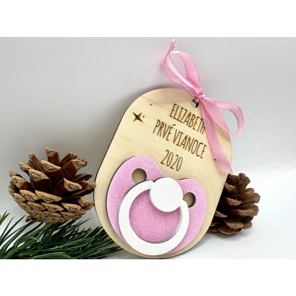 Vyrobená z kvalitného dreva, doplnená o jemnú ružovú mašličku a 3D motív cumlíka – symbol detskej nevinnosti.