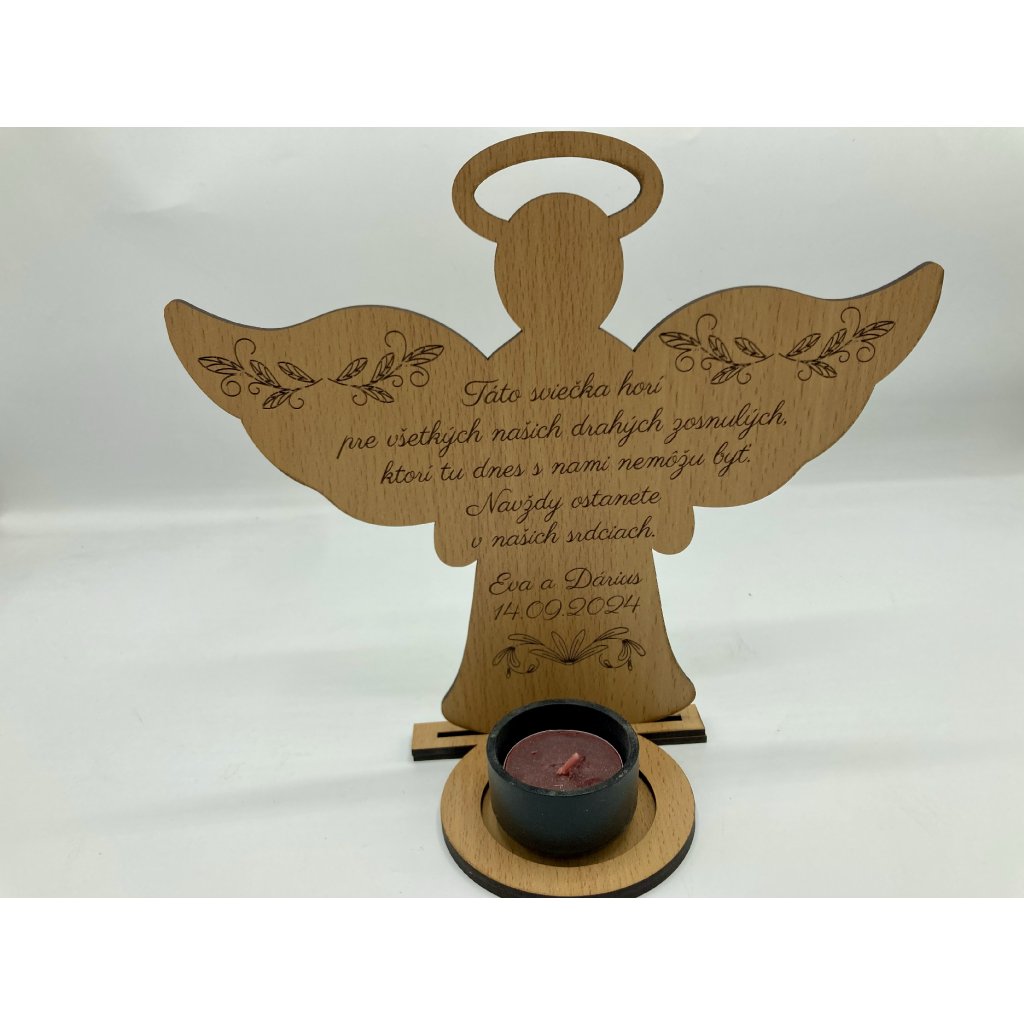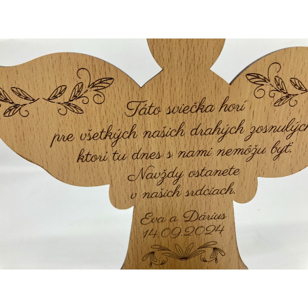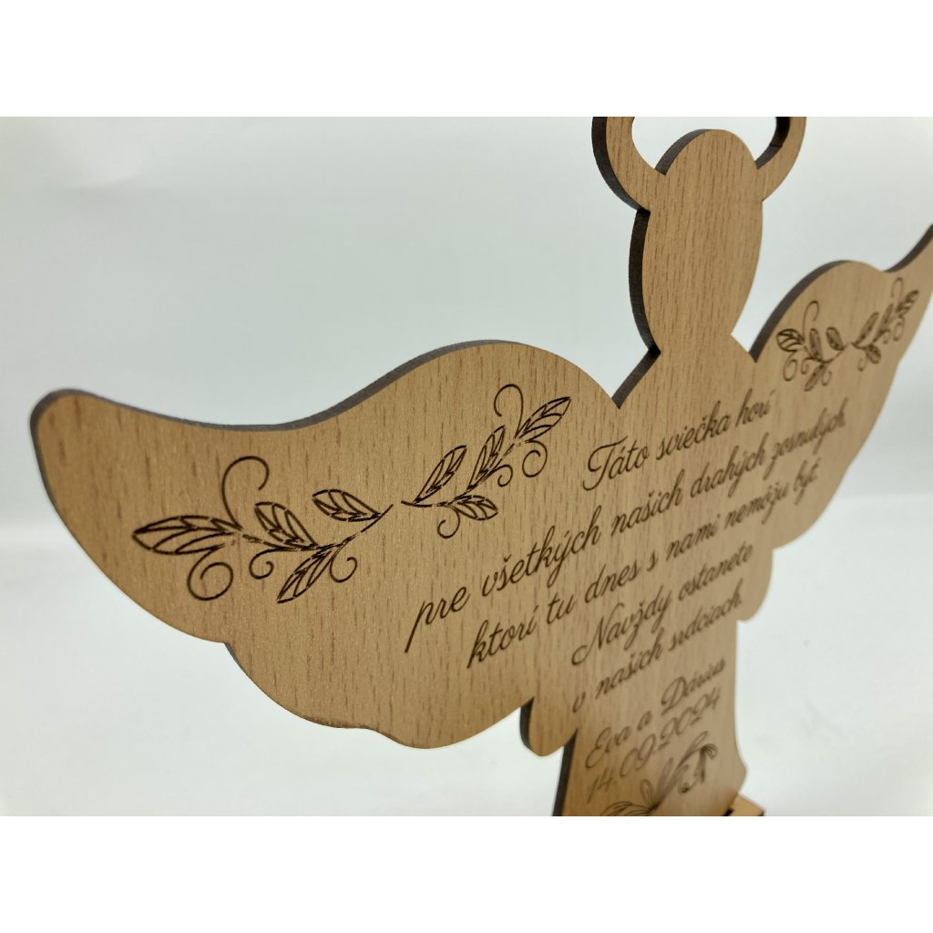 Každý anjelik je ručne vyrobený, máte na výber prírodný, biely a dekor buk. Drevený anjelik sa hodí do akéhokoľvek priestoru – či už ide o hrobové miesto, útulný kút vo Vašej domácnosti, špeciálnu spomienkovú vitrínu alebo súčasť Vášho svadobného stola, svadobnej výzdoby. Detaily sú precízne vyrezávané, čo zaručuje, že nejde len o obyčajný výrobok, ale o originálny kúsok, ktorý Vás bude sprevádzať po dlhé roky.