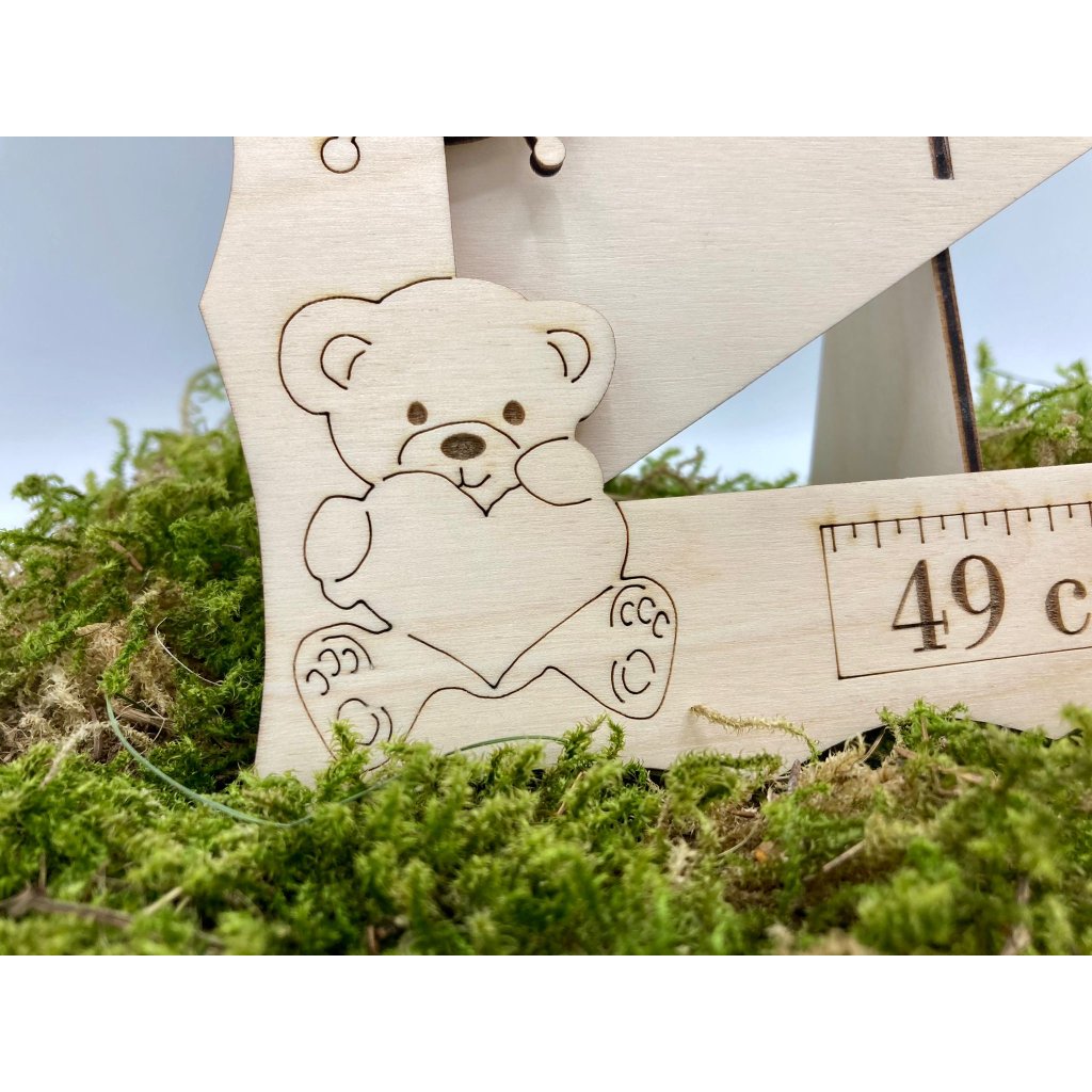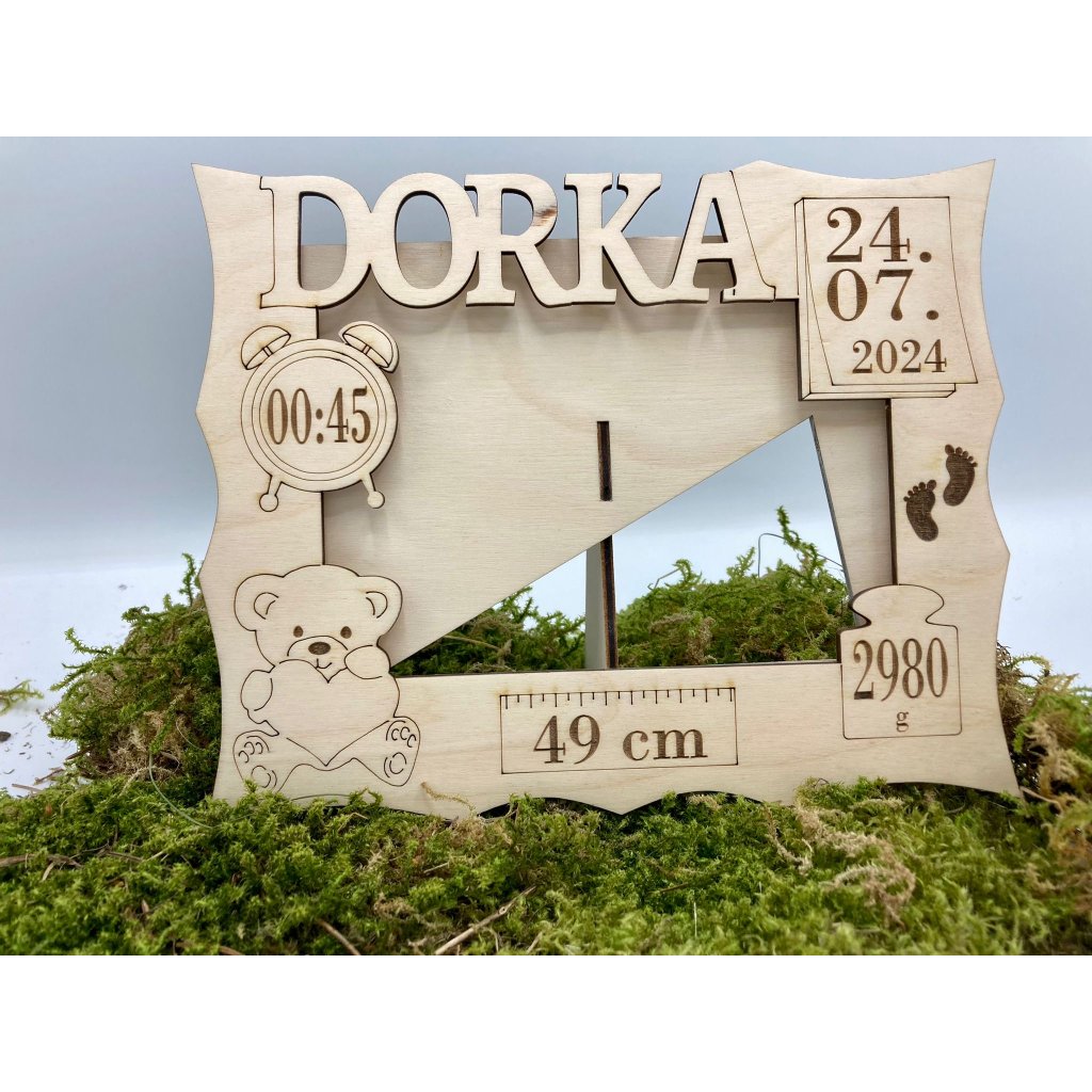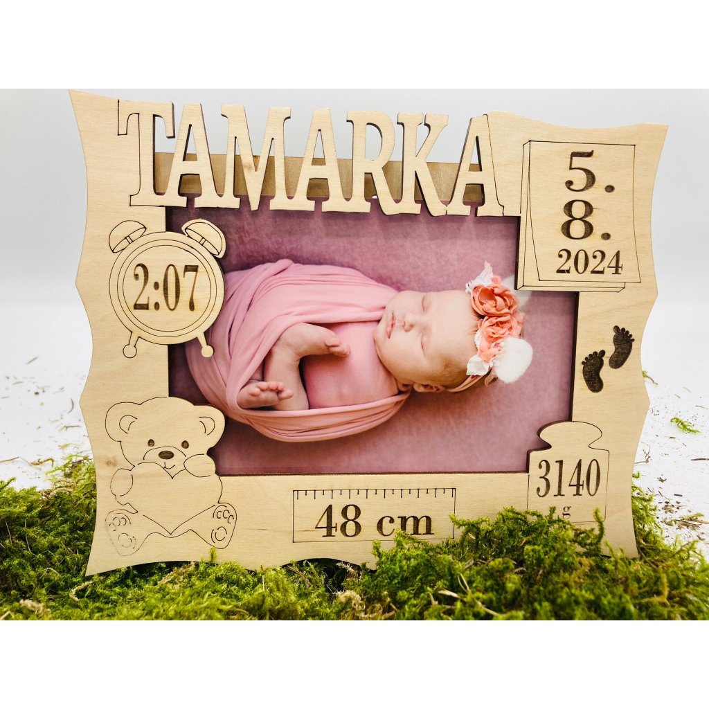 Drevený fotorámik vyrezaným menom a údajmi o narodení vášho dieťata.