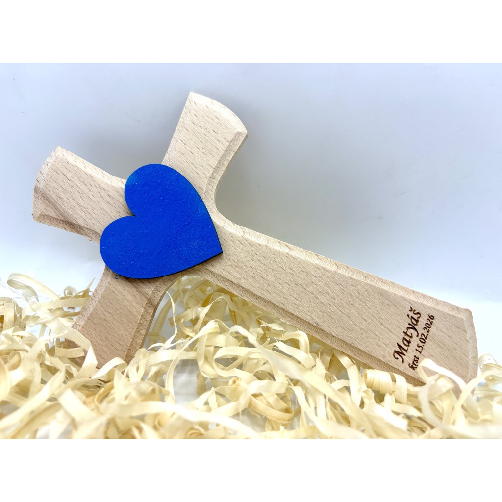 Drevený krížik ku krstu - Modré srdce