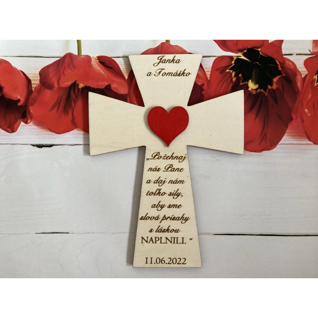 Drevený krížik na svadbu s gravirovanámi menami a červeným srdiečkom. Veľkosť krížika je 22x14cm.