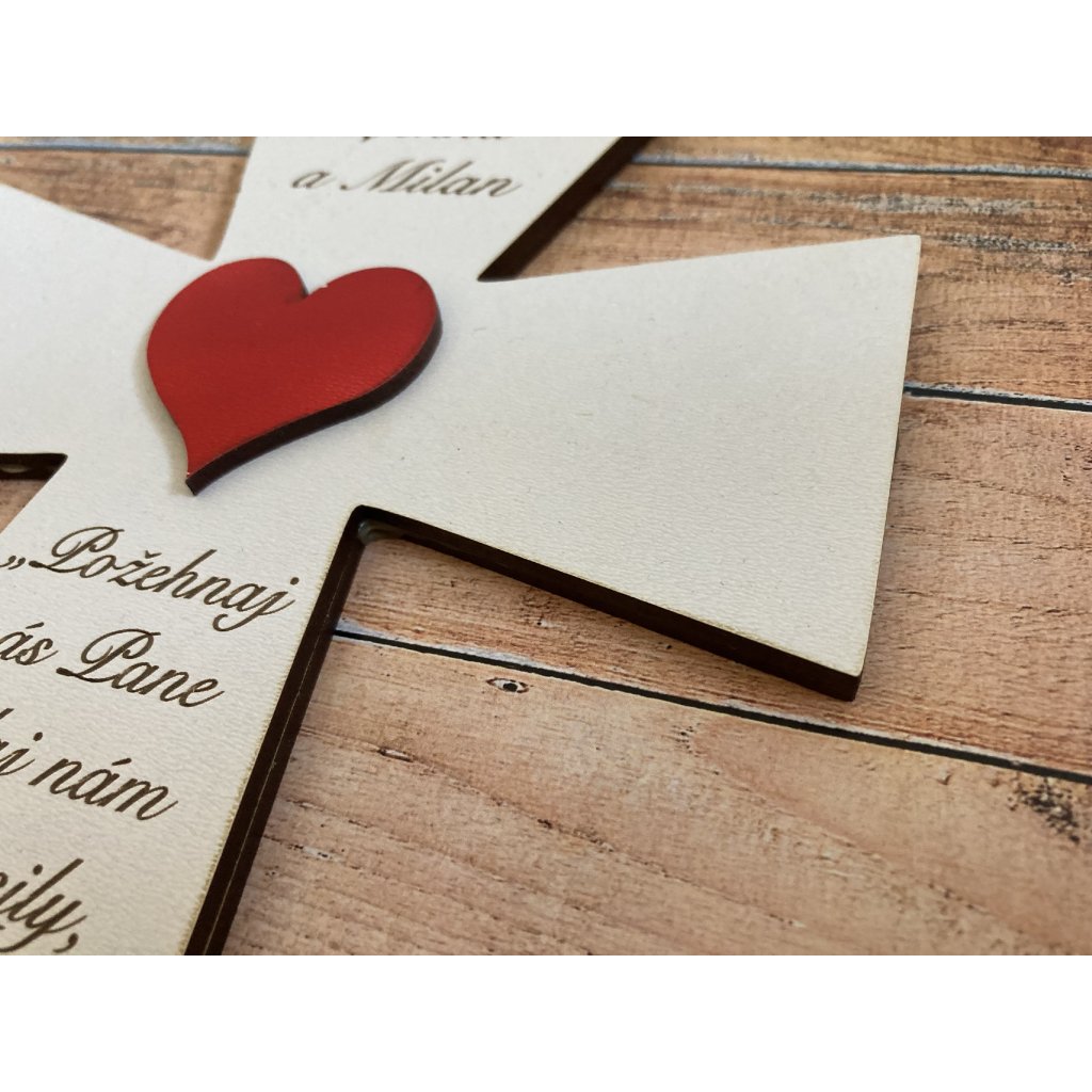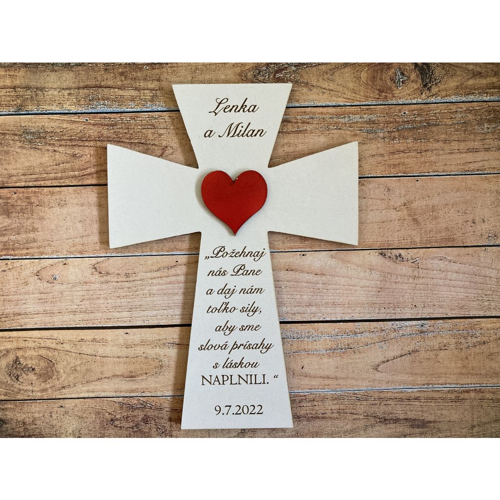 Drevený krížik na svadbu v bielej farbe s červeným srdiečkom s gravírovanými menami, dátumom svadby a citátom z Biblie.
