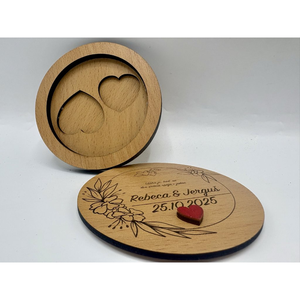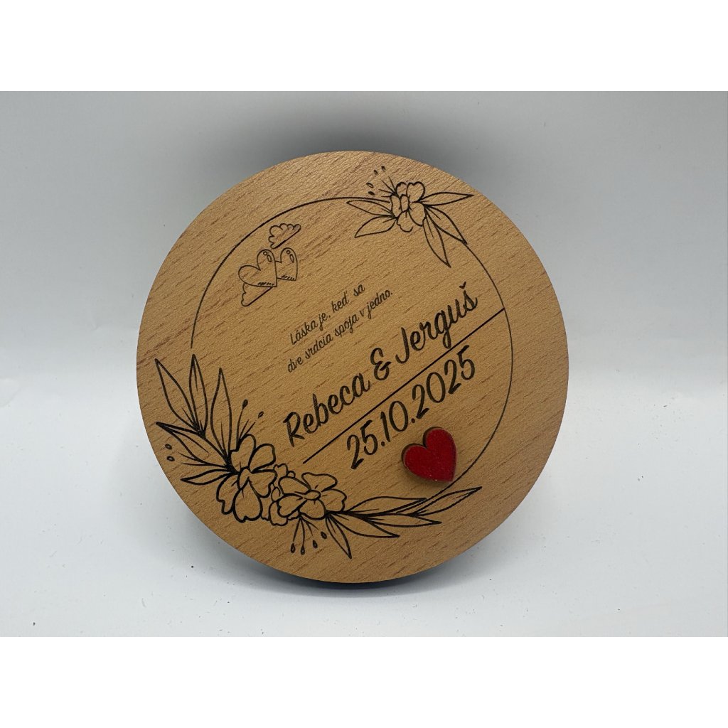 Drevený podnos pod obrúčky kruh s červeným srdiečkom