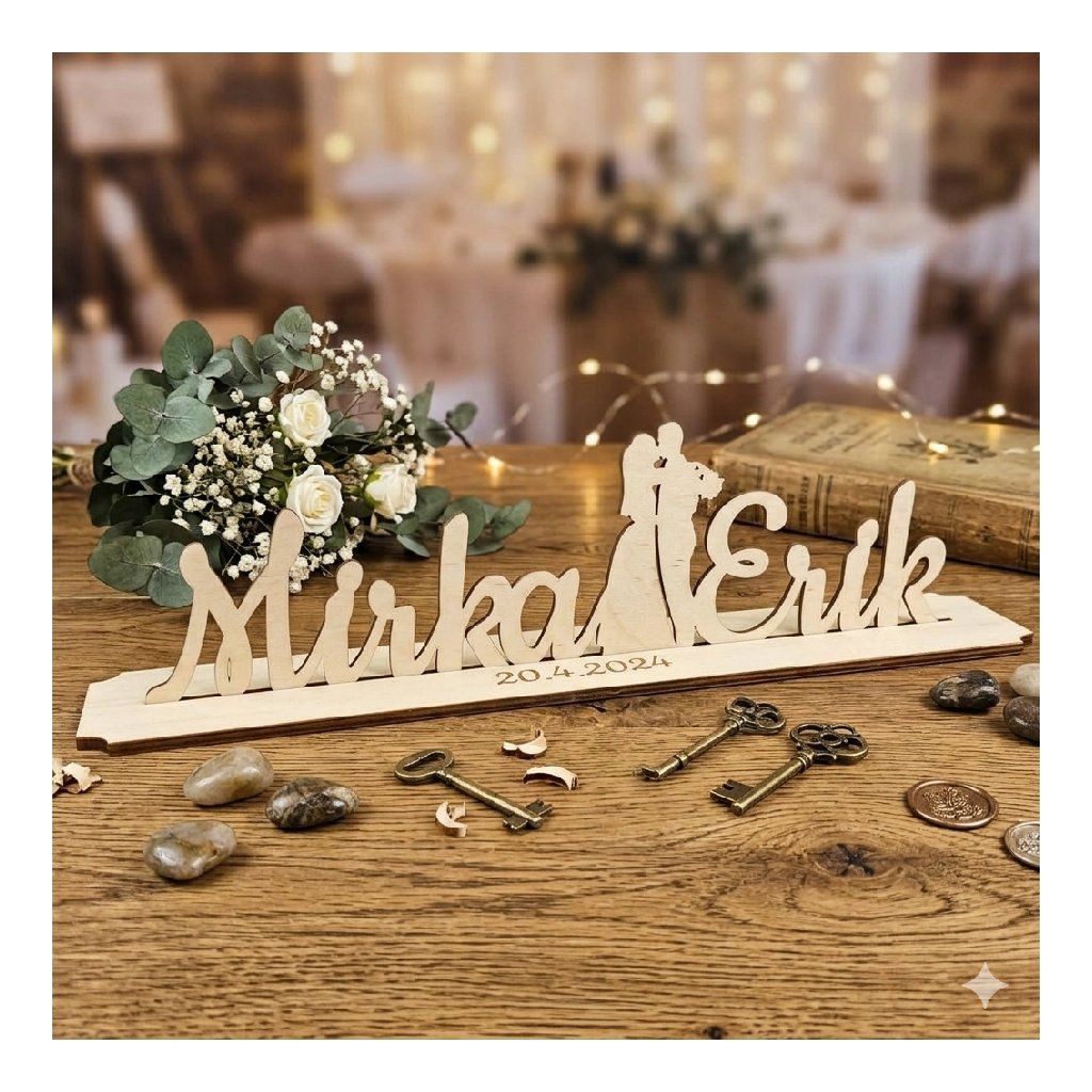 Drevený podstavec s menami a gravirovaným dátumom
