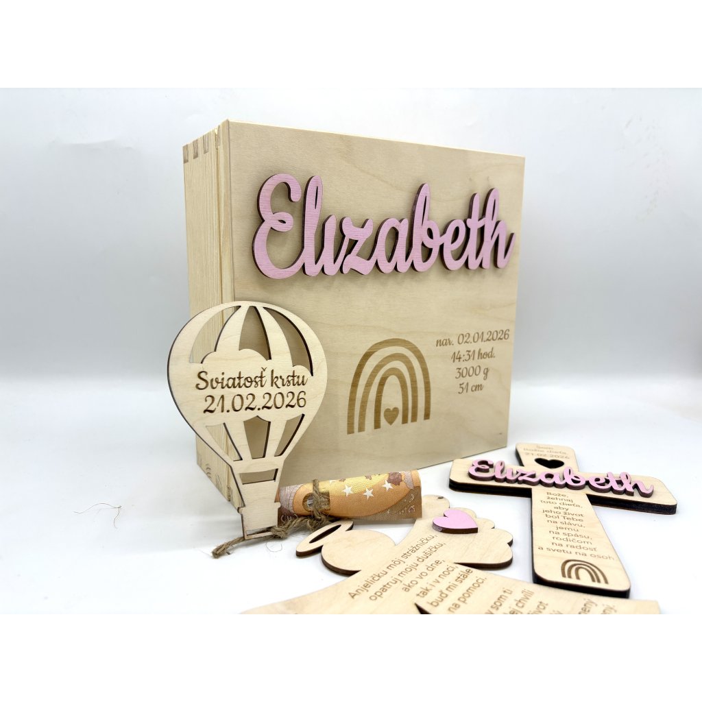 1. Drevená krabička: Pevná krabička s personalizovaným vekom, na ktorom je 3D meno dieťatka a gravírované údaje o narodení (dátum, čas, váha, výška)