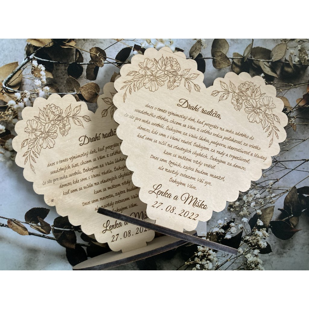 Originálne drevené poďakovanie poďakovanie rodičom, v tvare srdiečok s potlačenou grafikou priamo na dreve. Potešte svojich rodičov originálny darčekom na svadbu.