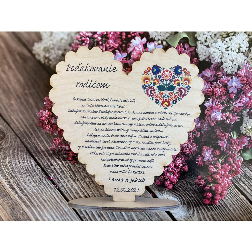 Originálne drevené poďakovanie poďakovanie rodičom, v tvare srdiečok s potlačenou grafikou priamo na dreve. Potešte svojich rodičov originálny darčekom na svadbu.