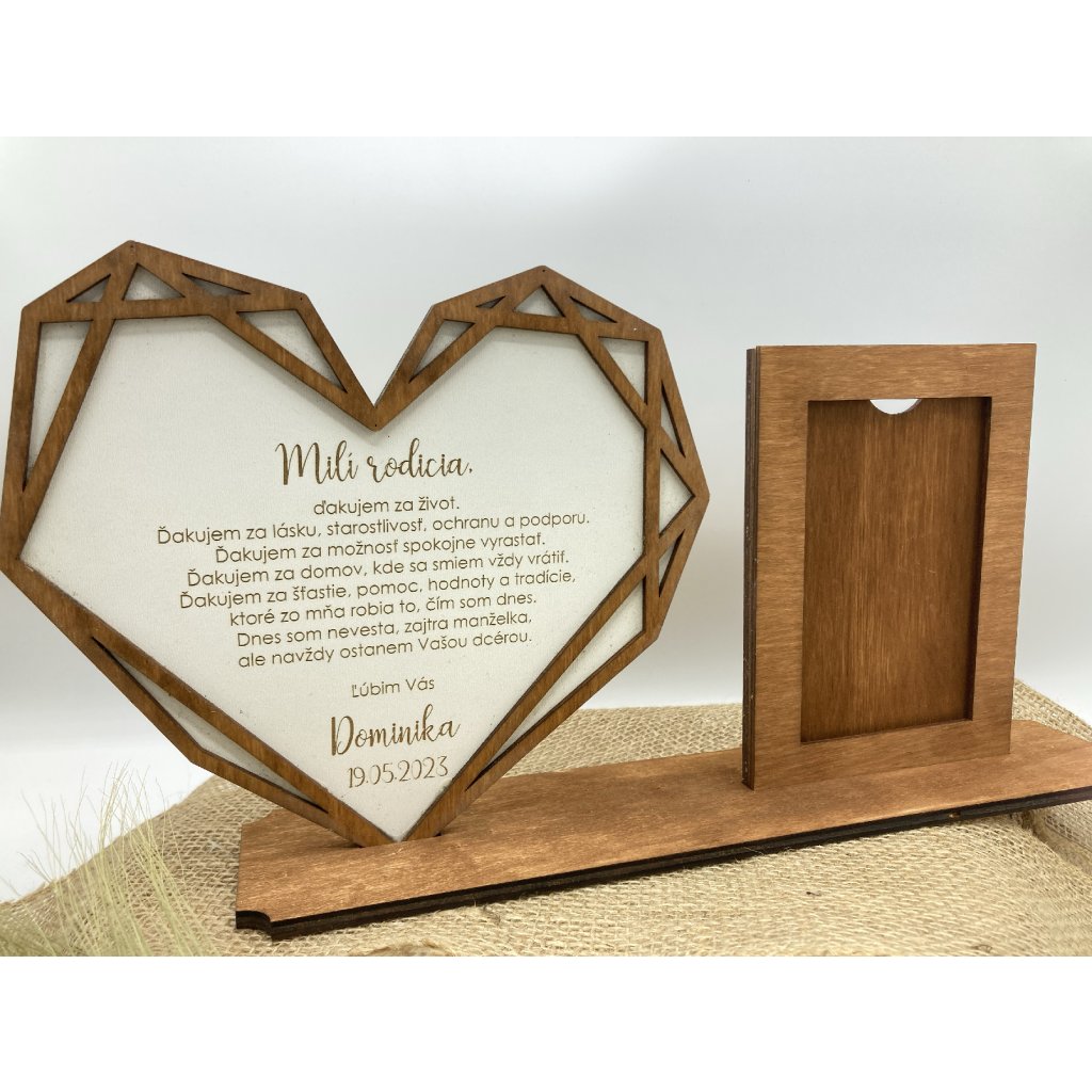 Originálne drevené poďakovanie poďakovanie rodičom, v tvare srdiečka s geometrickým rámom. Potešte svojich rodičov originálny darčekom na svadbu.