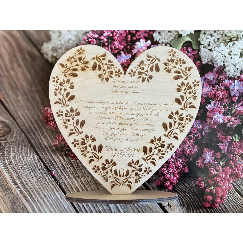 Originálne drevené poďakovanie poďakovanie rodičom, v tvare srdiečka s vzorom kvetov. Potešte svojich rodičov originálny darčekom na svadbu.