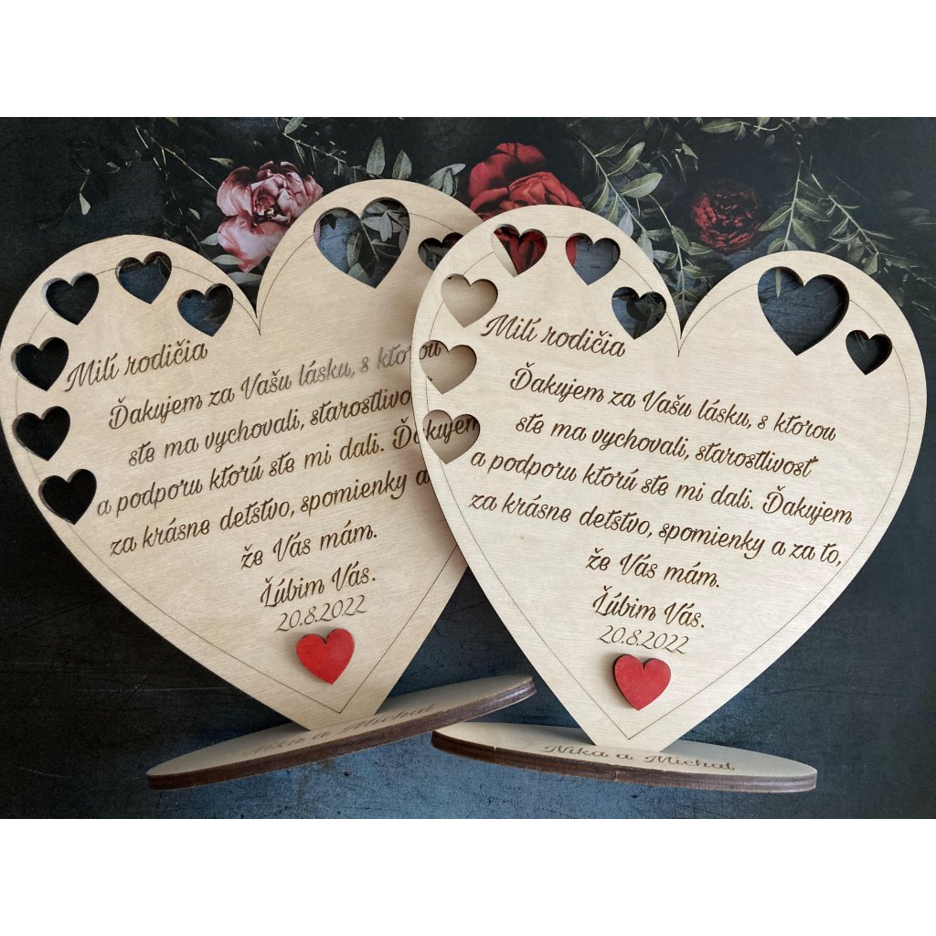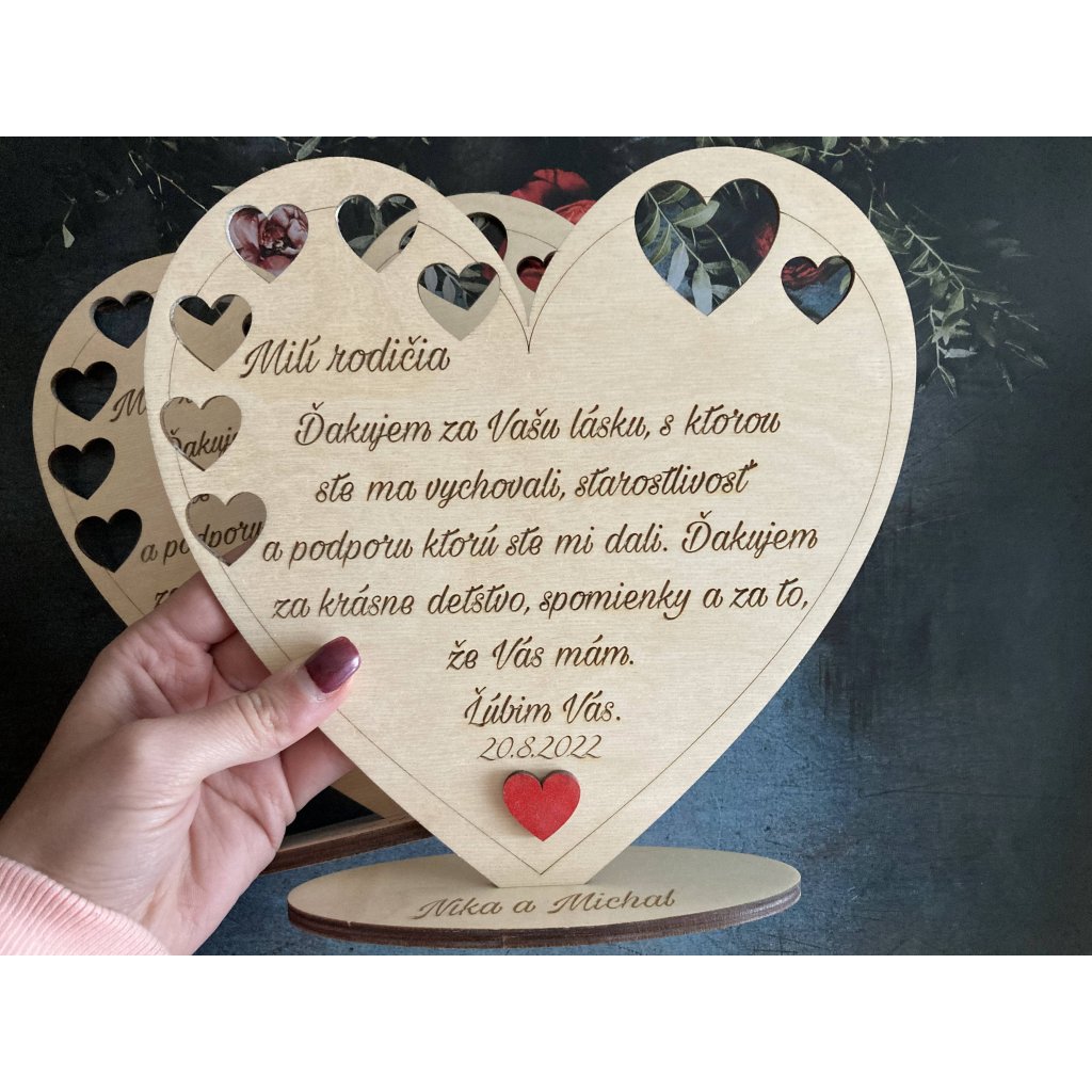Originálne drevené poďakovanie poďakovanie rodičom, v tvare srdiečka. Potešte svojich rodičov originálny darčekom na svadbu.