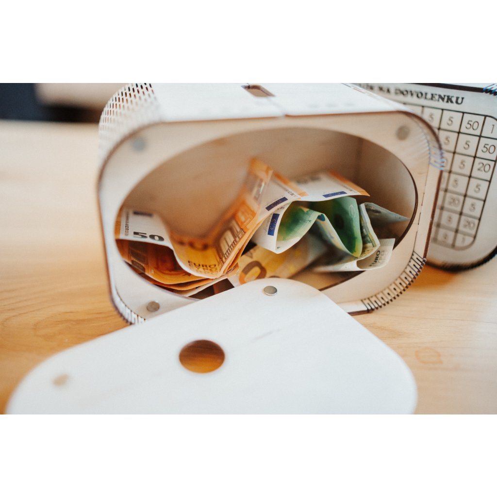 Drevená pokladnička ŠETRÍM NA DOVOLENKU_znovupoužiteľná