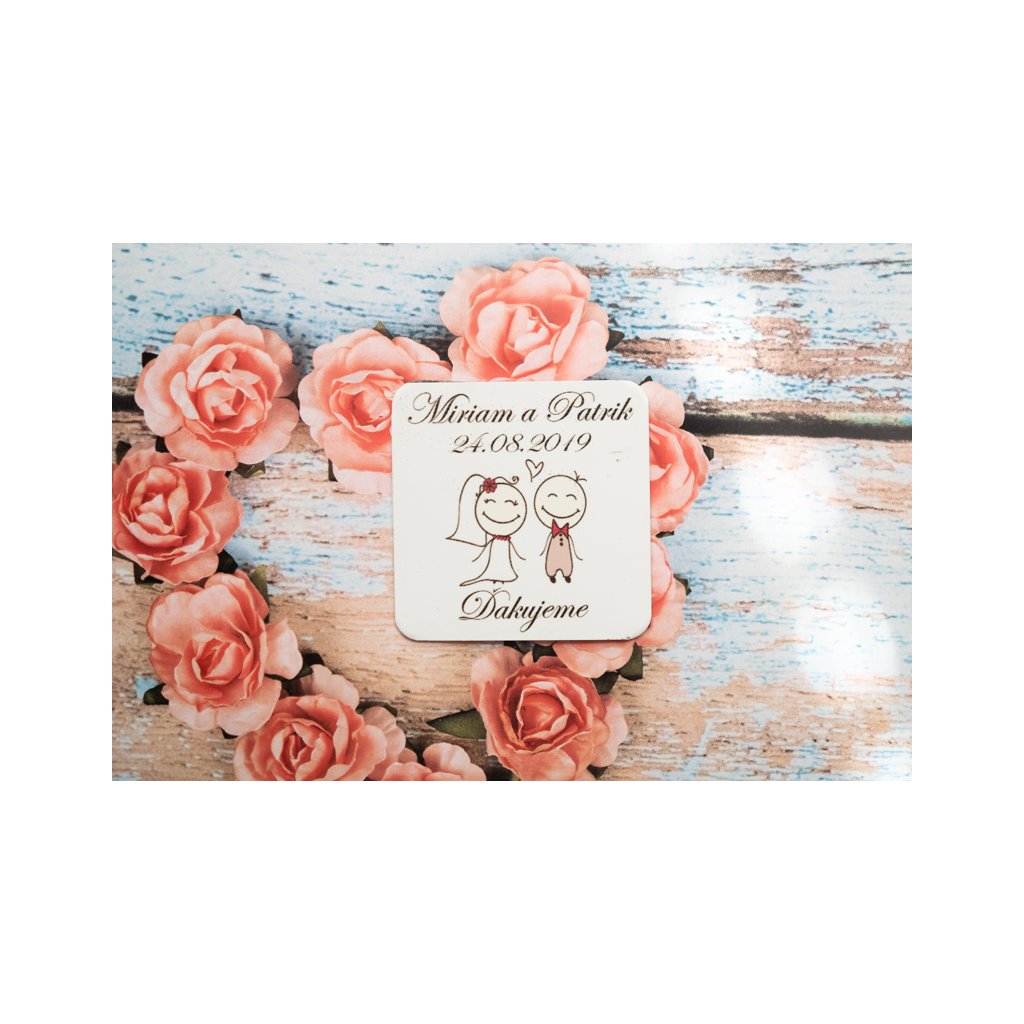Svadobná magnetka potlačená na hliniku tzv plechová magnetka je skvelým darčekom pre svadobných hostí . Magnetka je potlačená najkvalitnejšou tlačou preto má veľmi dlhú trvácnosť a krásne farby. Magnetka má rozmer 5x5 cm v prípade záujmu vieme vyrobiť aj v iných rozmeroch. Magnetku je možné potlačiť fotografiou, rôznou grafikou alebo firemným logom.
