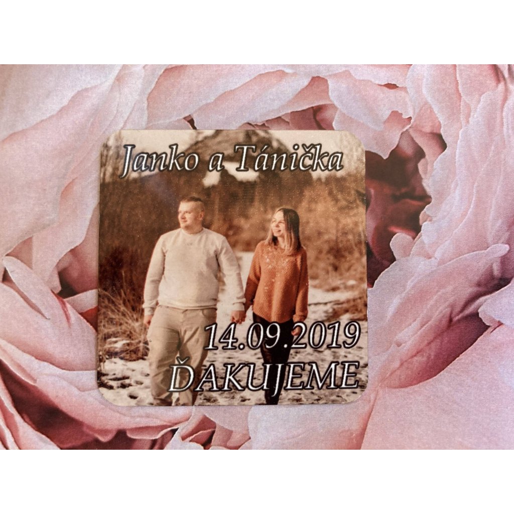 Svadobná magnetka potlačená na hliniku tzv plechová magnetka je skvelým darčekom pre svadobných hostí . Magnetka je potlačená najkvalitnejšou tlačou preto má veľmi dlhú trvácnosť a krásne farby. Magnetka má rozmer 5x5 cm v prípade záujmu vieme vyrobiť aj v iných rozmeroch. Magnetku je možné potlačiť fotografiou, rôznou grafikou alebo firemným logom.