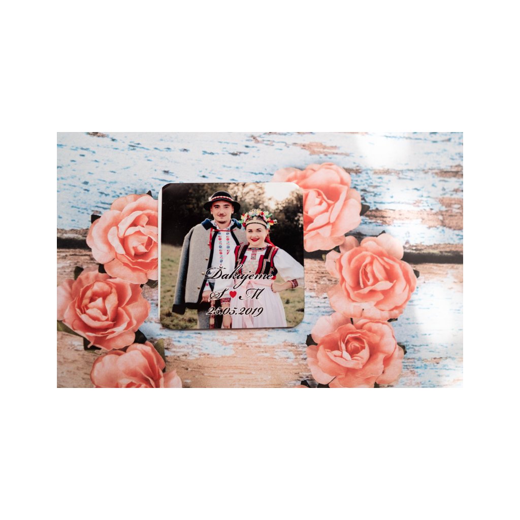 Svadobná magnetka potlačená na hliniku tzv plechová magnetka je skvelým darčekom pre svadobných hostí . Magnetka je potlačená najkvalitnejšou tlačou preto má veľmi dlhú trvácnosť a krásne farby. Magnetka má rozmer 5x5 cm v prípade záujmu vieme vyrobiť aj v iných rozmeroch. Magnetku je možné potlačiť fotografiou, rôznou grafikou alebo firemným logom.