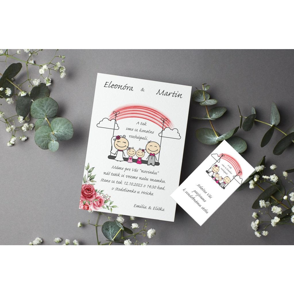 K oznámeniam vám vieme vyrobiť akýkoľvek produkt na mieru . Samozrejmosťou je svadobná pozvánka k svadobnému stolu, ktorá je grafický zladená