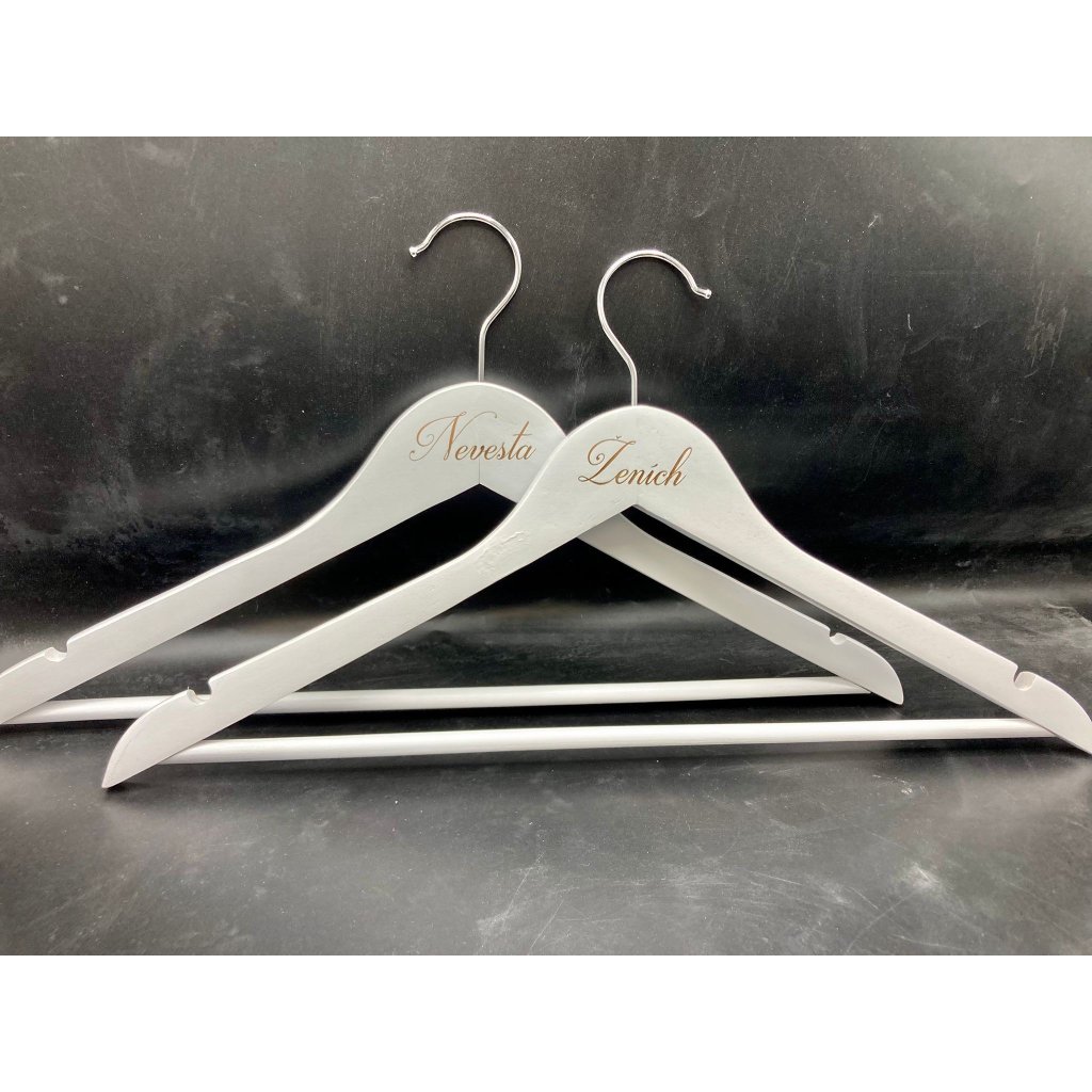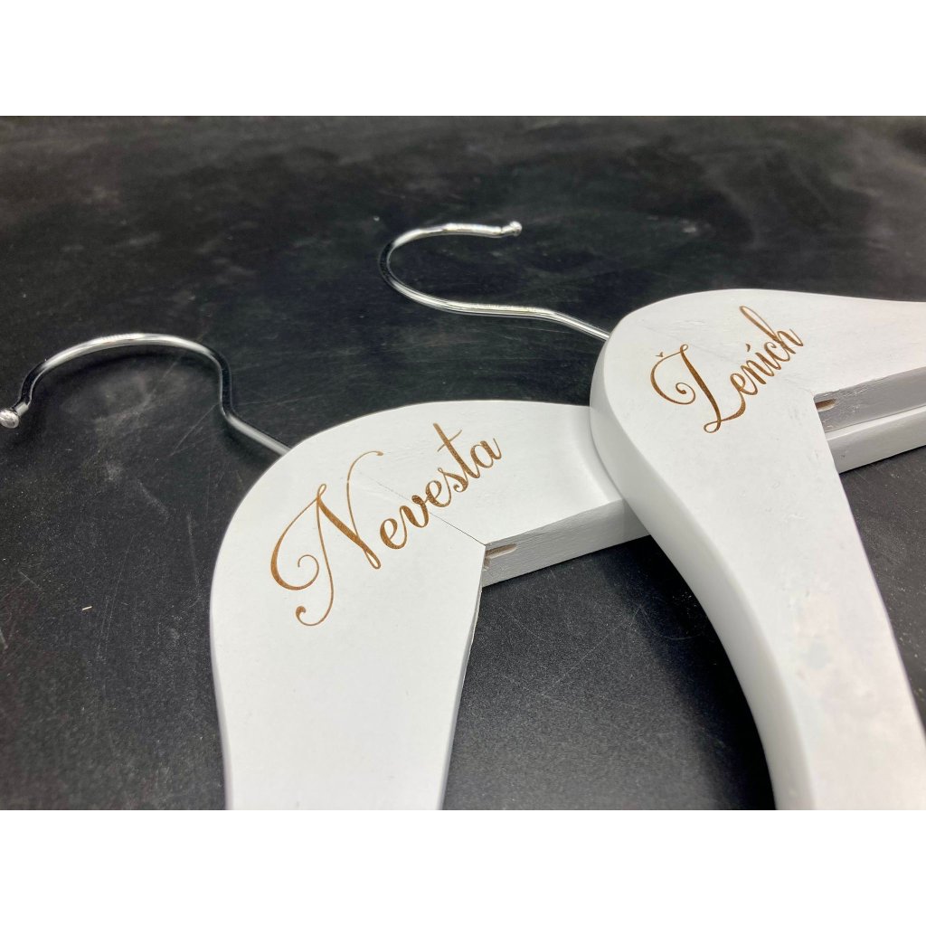 Svadobné vešiaky pre nevestu a ženícha. Vešiaky majú gravírovaný vzor.